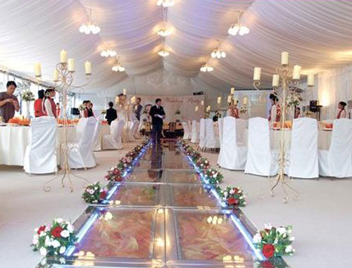 婚慶餐飲喜宴篷房采用高強(qiáng)度鋁合金框架,堅(jiān)固耐用,雙面PVC涂層刀刮布,并有多種顏色可選用,抗風(fēng)防雨,一至兩天就可搭建完一個(gè)非常大的婚宴篷房,再經(jīng)過匠人們的精心裝飾,很快就會(huì)成為一座豪華的非常溫馨的婚禮殿-堂。